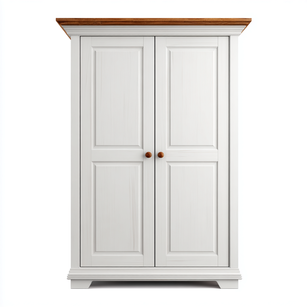 Realizzato in legno con finitura bianca uniforme. Il piano superiore presenta una finitura effetto legno naturale che valorizza il contrasto cromatico e l'estetica complessiva.