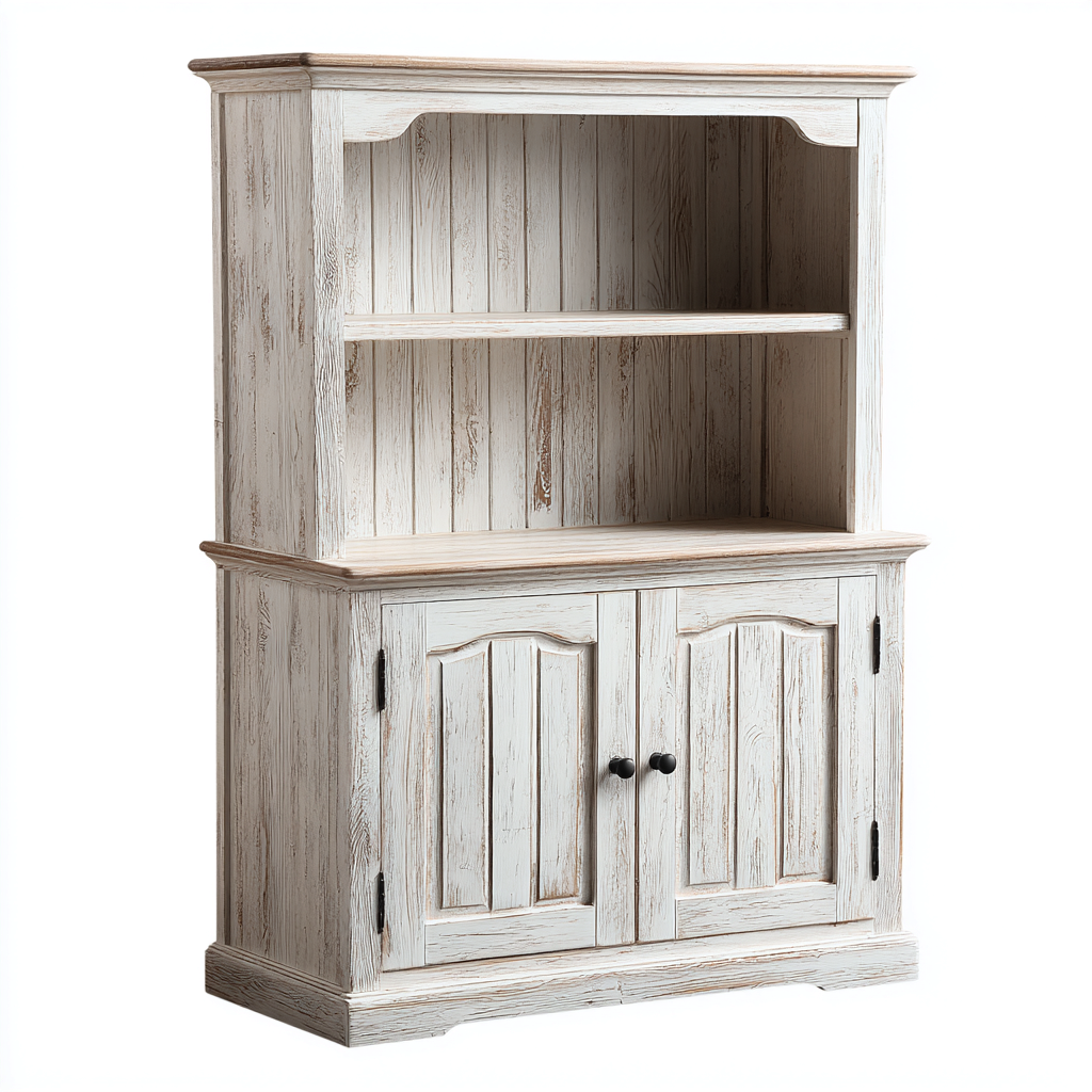 Mobile da cucina alto in stile rustico con finitura effetto decapato, progettato per offrire una soluzione di contenimento funzionale e decorativa. La struttura combina una sezione superiore aperta con una base chiusa, ideale per l'organizzazione della cucina.