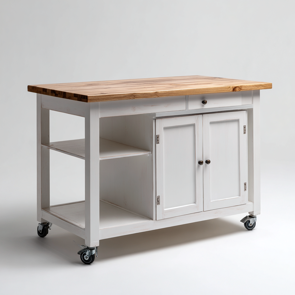 Questa isola da cucina offre una soluzione pratica per ampliare la superficie di lavoro e migliorare l'organizzazione dello spazio. Il piano superiore in legno naturale garantisce un'area funzionale per la preparazione degli alimenti, mentre la struttura compatta si adatta facilmente a diversi stili di cucina.