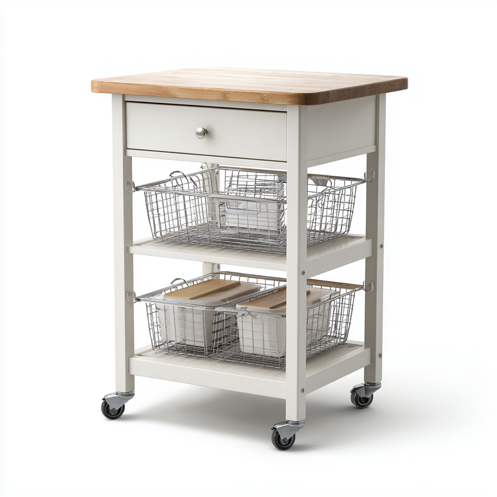 L'isola da cucina combina un piano di lavoro compatto con soluzioni di contenimento pratiche. Il cassetto superiore consente di riporre utensili di uso frequente, mentre i cestelli in metallo permettono una facile organizzazione di alimenti, accessori e piccoli oggetti.