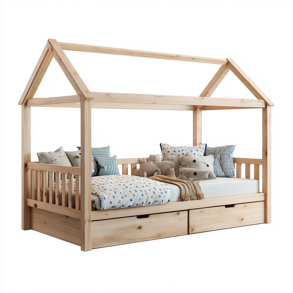 Questo letto per bambini con struttura a casetta crea un ambiente caldo e accogliente nella cameretta. Il design aperto richiama la forma di una piccola casa, favorendo un senso di sicurezza e rendendo lo spazio adatto sia al riposo sia al gioco quotidiano.