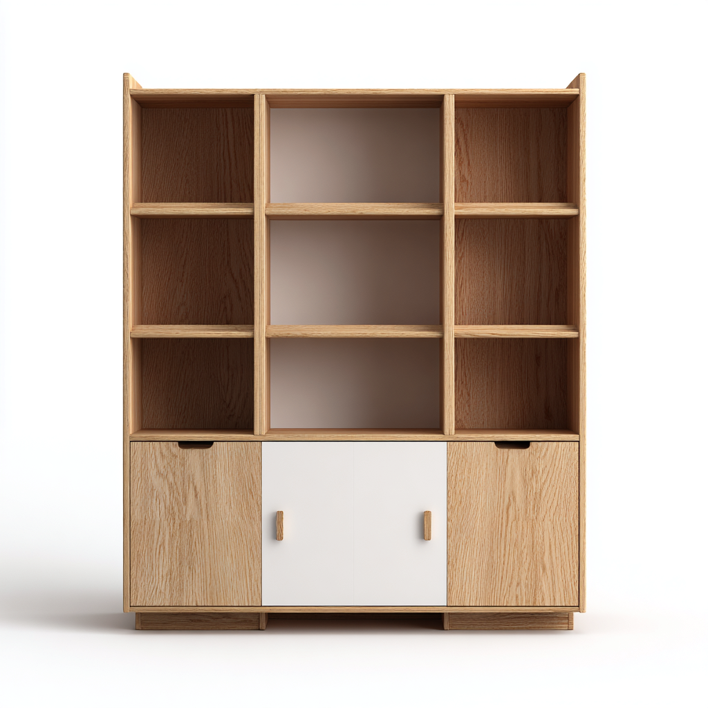 Questa libreria combina vani a giorno e spazi chiusi per offrire una soluzione di contenimento funzionale e ordinata per ambienti interni come soggiorni, studi o sale da pranzo. La struttura verticale permette di organizzare libri e oggetti mantenendo un aspetto equilibrato.