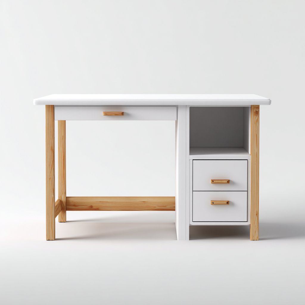 Scrivania per bambini dal design funzionale e proporzioni equilibrate, adatta allo studio quotidiano, alla lettura e alle attività creative. La struttura combina superfici chiare e dettagli in legno naturale, ideale per camerette e spazi studio ordinati.