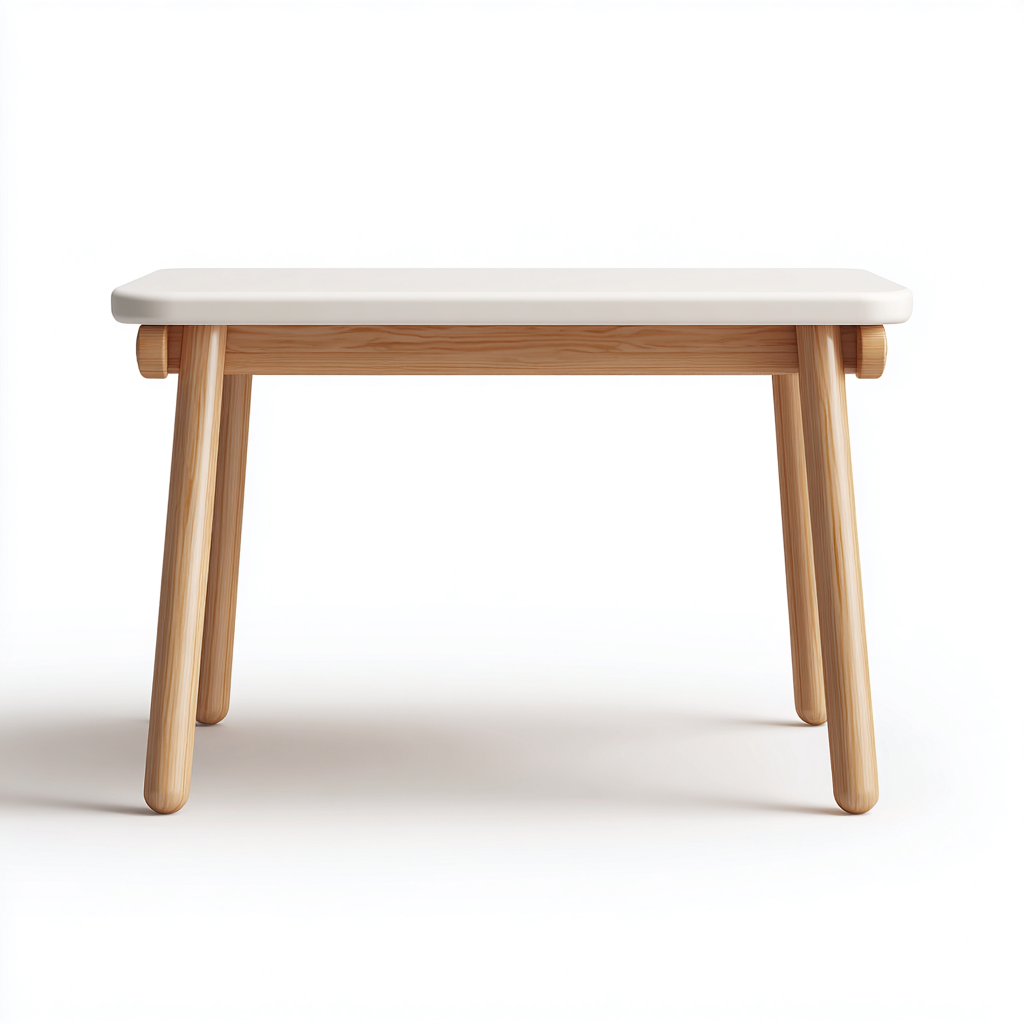 Struttura realizzata in legno massello con gambe in finitura naturale e piano superiore bianco. I bordi arrotondati e la superficie liscia sono pensati per un utilizzo quotidiano confortevole.