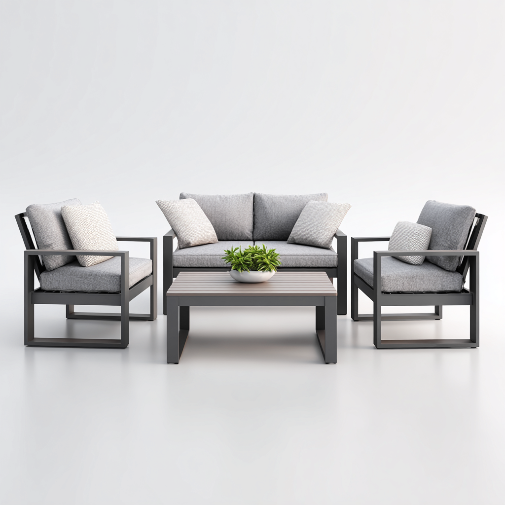 Questo set salotto da terrazza con struttura in metallo presenta un design moderno e lineare, ideale per arredare con stile gli spazi outdoor.