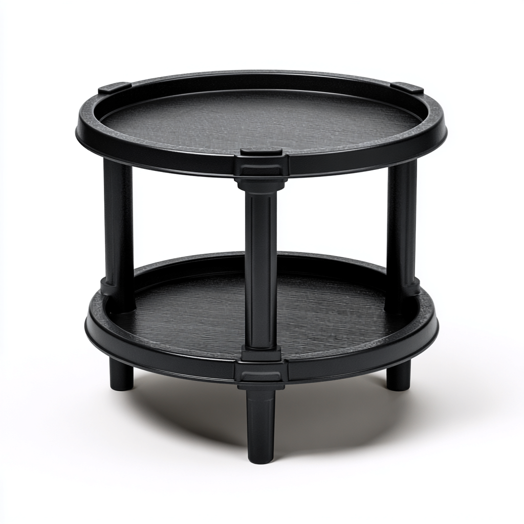 Il piano superiore rotondo offre una superficie pratica per appoggiare bevande o piccoli oggetti. La presenza di un secondo vassoio inferiore permette di organizzare accessori o elementi di uso frequente, ottimizzando lo spazio disponibile.