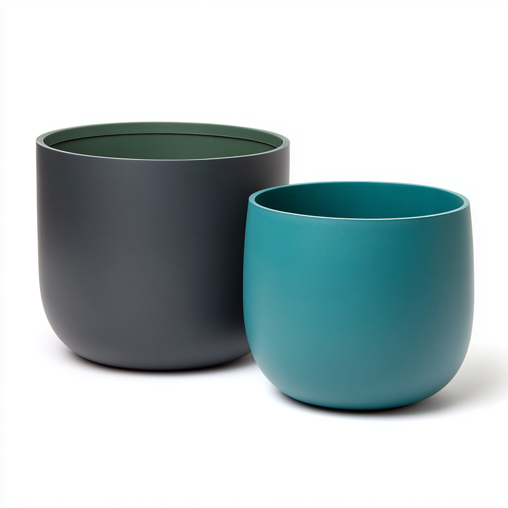 I vasi sono realizzati in plastica resistente con finitura opaca nei colori grigio scuro e verde petrolio, leggeri e facili da posizionare.