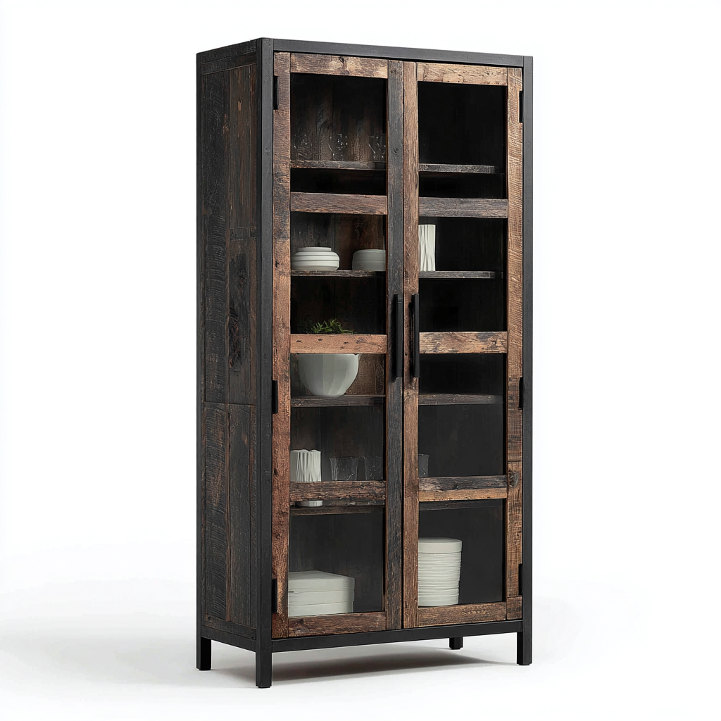 Questa vetrina alta in stile industriale è pensata per il soggiorno o la sala da pranzo. La combinazione di struttura scura e superfici effetto legno valorizza stoviglie, libri e oggetti decorativi, creando un forte impatto visivo.